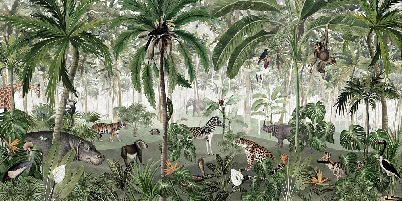 Unsere Babytapete Harmonie der Tiere ist ein Kinderwandbild, das der Natur huldigt. Auf dieser herzerweichenden, maßgefertigten Panorama-Tapete entdecken Sie die Tiere des Dschungels in Lebensgröße beim Spazierengehen. Diese Dschungel-Tapete Tiere für Babys wurde bis ins kleinste Detail durchdacht, damit Ihr Kind beim Betrachten seiner neuen Wand seine Sinne entwickeln kann. Sanfte Kurven, zarte und warme Farben - teilen Sie glückliche Momente im Zimmer Ihres Kindes mit diesem kindlichen Tier-Wandbild.