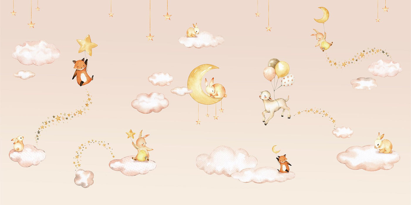 Kaufen Sie Ihre Babytapete online, und gestalten Sie die Dekoration seines Zimmers geschmackvoll und einfach. Die Wolken- und Tiermotive auf dieser Tapete sind herzerweichend.
