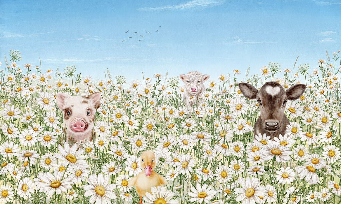 Erleben Sie neue Abenteuer mit unserer neuen Babytapete "Sweet Prairie". Eine natürliche Kindertapete, die uns an die Freuden und einfachen Schönheiten der Natur erinnert: ein blühendes Feld mit Gänseblümchen, der blaue Himmel und glückliche Tiere. Mit dieser Kindertapete wird Ihre Wanddekoration der Natur so nahe wie möglich kommen. Ein Kinderzimmer oder ein Babyzimmer wird durch ein kindgerechtes und originelles Wandbild sublimiert, das sich mit Ihrem Kind weiterentwickeln wird.