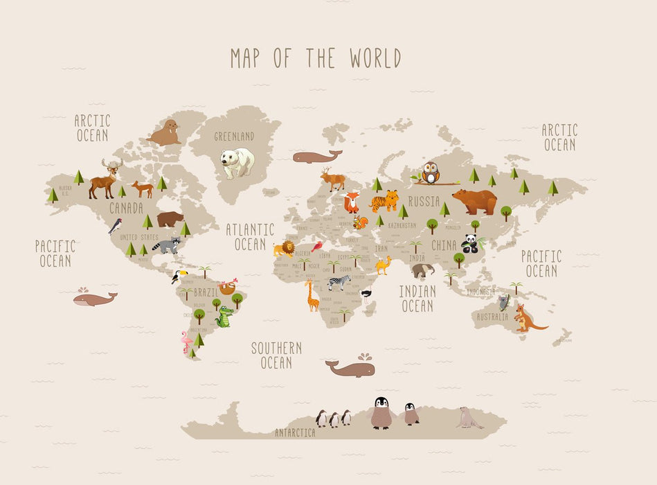 Illustrierte Weltkarte Tiere beige