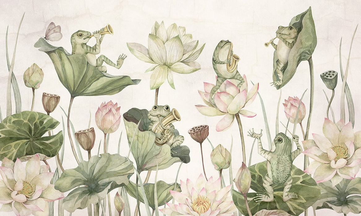 Die Kindertapete "Musikalische Frösche" bringt Schwung in das Zimmer Ihres Kindes! Diese Kindertapete zeigt niedliche Frösche, die in Blumen und Seerosen Musik machen. Mit ihren sanften Pastellfarben beruhigt diese dynamische Tapete Ihr Kind, wenn es ein Nickerchen macht oder sich ausruht. Diese Wanddekoration ist ideal für das Babyzimmer, da sie die Sinne des Babys anregt und seine sensorischen Fähigkeiten entwickelt.