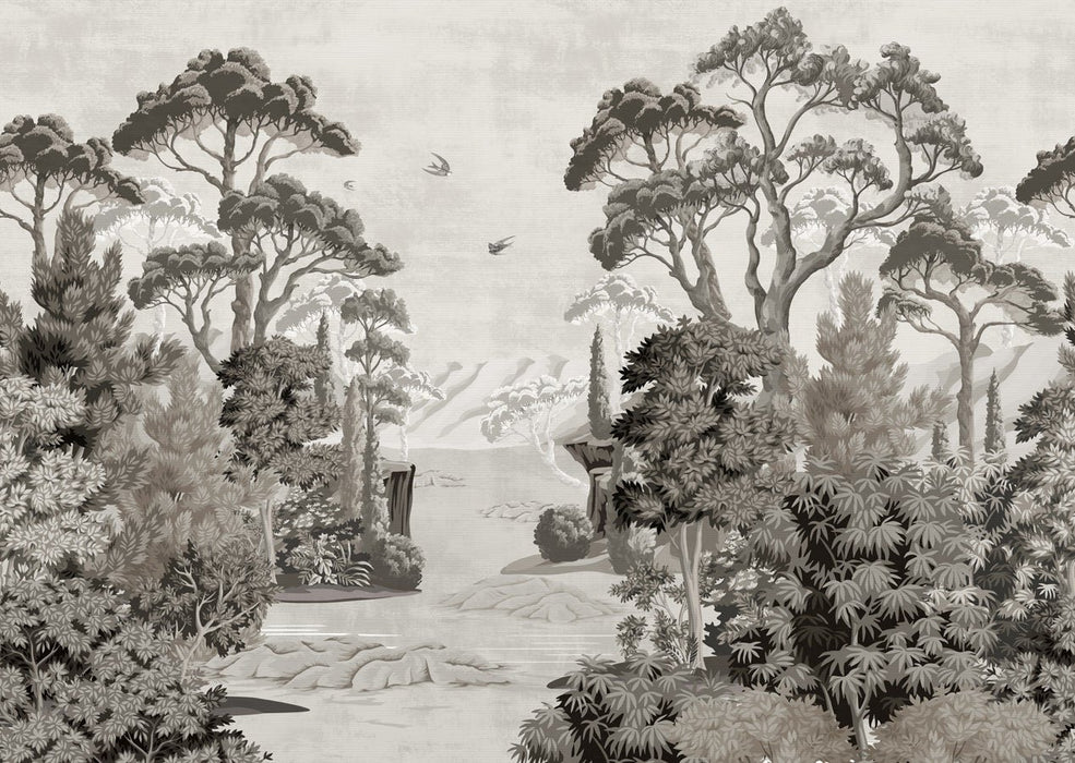 Ein Aquarellmotiv, ein Gemälde einer Landschaft aus vergangenen Zeiten, diese Panorama-Tapete wird Ihre Wohnung mit Eleganz und Charakter verschönern. Die einfarbige Tapete im alten Stil ist ideal für Schlafzimmer, Wohnzimmer und Eingangsbereiche, um Ihrem Zuhause Chic und Raffinesse zu verleihen. Mit diesem maßgefertigten Wandgemälde schaffen Sie eine schicke Inneneinrichtung. Dieses Wandbild ist eine Retro-Illustration, die überarbeitet und modernisiert wurde, um sich an die heutige Einrichtung anzupassen und dabei einen eleganten Touch von früher zu behalten. Das Schwarz-Weiß-Thema passt perfekt zu Deko-Objekten aus Holz, Rattan, Bambus und Haussmann-Zierleisten.
