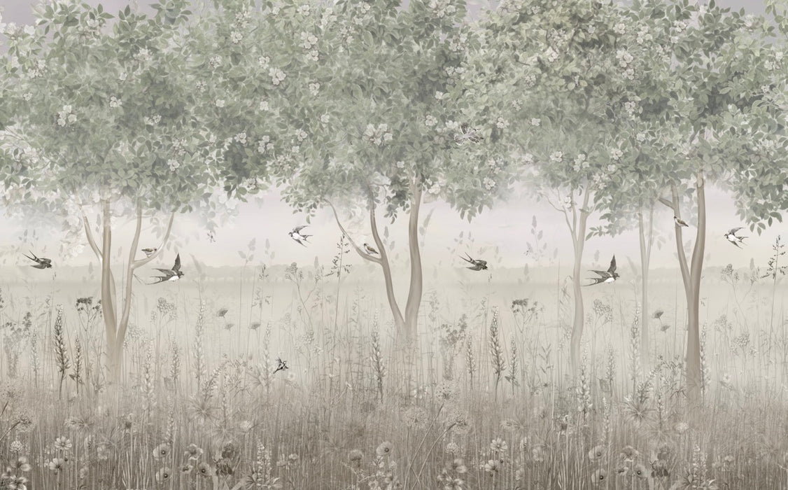 Die sanften Grüntöne, das neblige Beige und das poetische Grau vermitteln ein Gefühl von Ausgeglichenheit und Sanftheit, perfekt für eine natürliche und zeitlose Dekoration. Jedes Detail, von den Feldblumen bis zu den fliegenden Schwalben, erinnert an einen Spaziergang am frühen Morgen in einer unberührten Landschaft.
