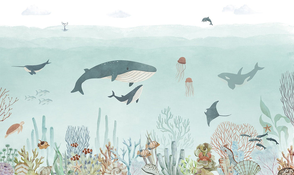 Entdecken Sie mit dieser XXL-Wanddekoration eine Meereswelt, die von Walbabys und fröhlichen, verspielten Fischen bevölkert wird. Die charmanten und süßen Designs werden die Fantasie Ihres Babys anregen und jeden Moment, den es in seinem Zimmer verbringt, noch magischer machen.