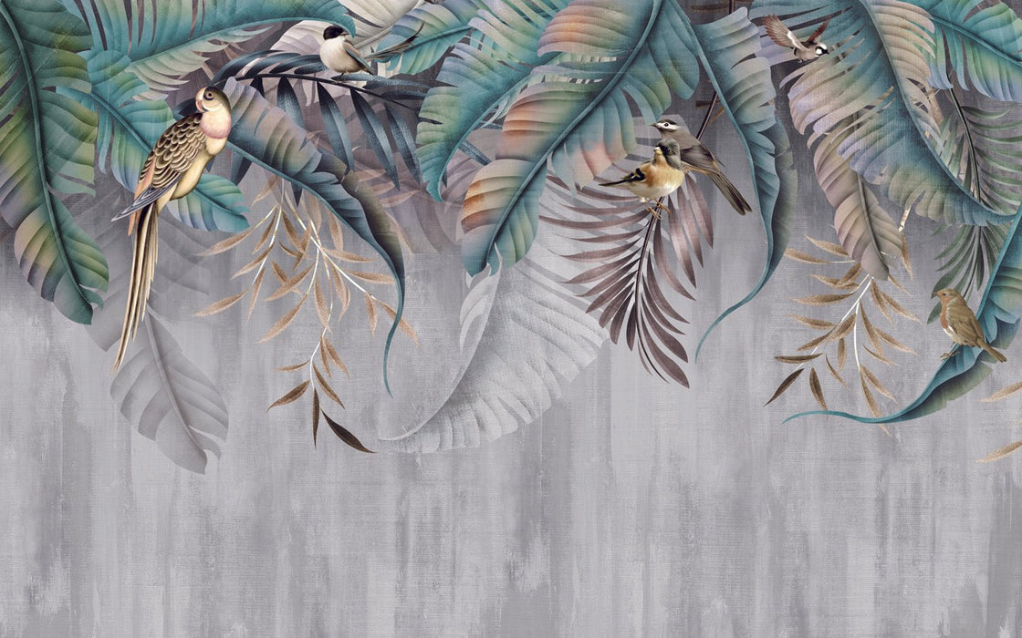 Holen Sie sich die Natur ins Haus mit unserer Fototapete Blätter & Vögel. Ideal für ein Schlafzimmer am Kopfende des Bettes, ein Wohnzimmer oder einen Eingangsbereich, bringt dieses Wandbild einen pflanzlichen, exotischen Touch in Ihr Zuhause. Erstellen Sie ganz einfach ein einzigartiges Interieur mit unseren maßgefertigten Panorama-Tapetens.
