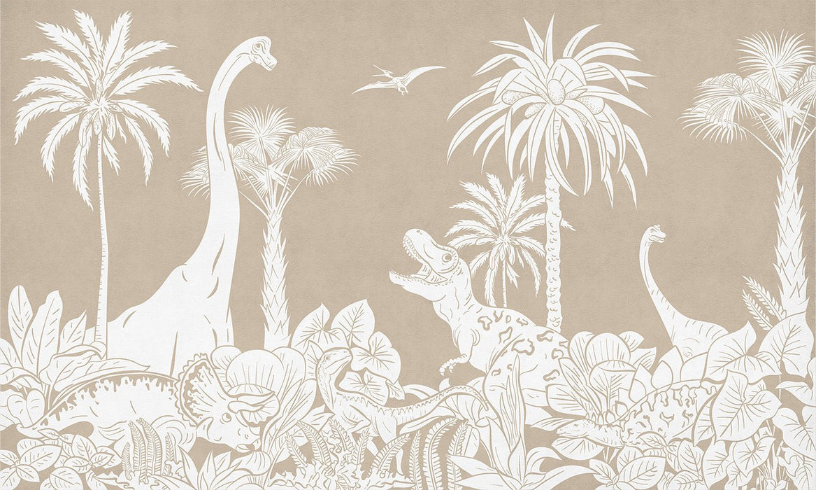 Gestalten Sie das Zimmer Ihres Kindes mit unseren einfarbigen, beigen Fototapeten Dinosaurier! Diese Fototapete mit Illustrationen aus der Welt der Dinosaurier wurde speziell für Kinderzimmer entworfen. Dieses Dinosaurier-Wandbild ist perfekt: Es sorgt mit seiner weichen, monochromen, pastellfarbenen Beige-Farbe für eine beruhigende Atmosphäre. Mit den Dinosaurier-Motiven bringt diese Kinder-Panorama-Tapete Abenteuer mit sich. Eine gemischte Tapete, die wir lieben.