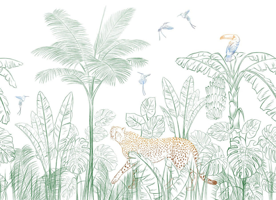 Eine wilde und gleichzeitig moderne Note mit unserer grünen Dschungeltapete mit Leopardenmuster. Ein reines Dschungelmotiv, das mit einem grünen Strich gezeichnet wurde, wird neu interpretiert, um Ihrem Zuhause Chic und Raffinesse zu verleihen. Die Tapete im Dschungelstil ist ideal für Schlafzimmer, Wohnzimmer und Eingangsbereiche. Mit diesem Wandbild schaffen Sie eine tropische Atmosphäre. Dieses Dschungel-Wandbild passt perfekt zu Deko-Objekten aus Holz, Rattan und Bambus.