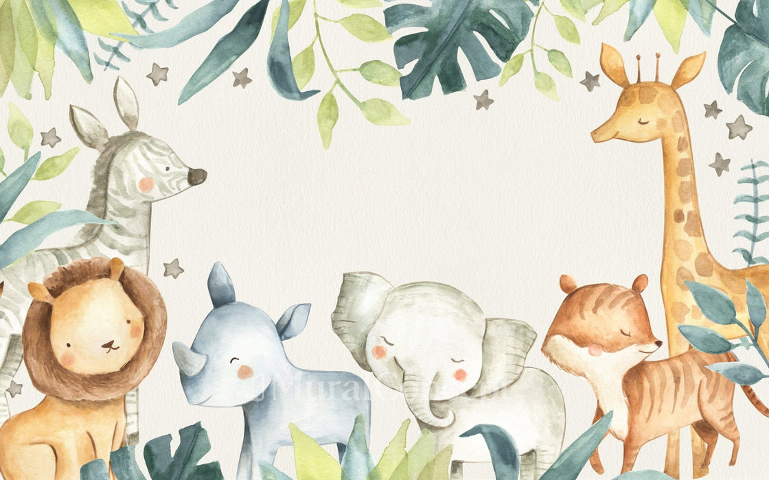 Holen Sie sich mit dieser Tapete in sanften Farben und mit Motiven von Dschungeltierchen-Babys eine sanfte Note ins Kinderzimmer. Die zarten Aquarellmotive werden Ihr Kind beruhigen. Hell und in nordischen Tönen eignet sich dieses Wandbild für Kinder- und Babyzimmer. Erstellen Sie ganz einfach die Fantasiewelt, von der Ihr Kind schon immer geträumt hat, mit unserer Panorama-Tapete nach Ihren Maßen.