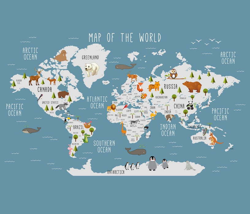 Diese dunkelblaue, illustrierte Weltkarten-Tapete Tiere ist perfekt für die spielerische Dekoration eines Kinderzimmers. Die Pastellfarben und die Tiere der Welt werden für einen sanften Stil und eine Atmosphäre sorgen, die zum Entspannen einlädt. Ein tolles visuelles Ensemble, um Kinder zu faszinieren und zu unterhalten. Erstellen Sie ganz einfach eine kindliche und verspielte Dekoration mit dieser Tapete in Ihren Maßen! Ihre Wanddekoration wird auf eine wasserdichte Tapete mit seidigem, glänzendem Stoffeffekt gedruckt.