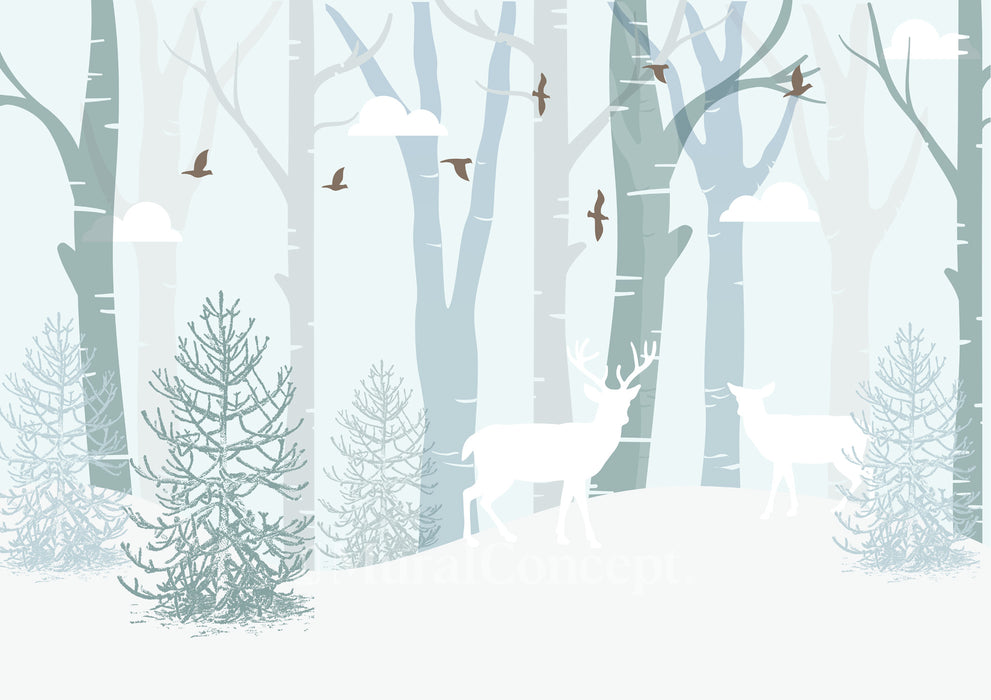 Verleihen Sie dem Zimmer Ihres Kindes mit unserer Tapete "Lappland" einen magischen Touch. Dieses märchenhafte skandinavische Dekor mit einem verschneiten Wald lädt dazu ein, in einen sanften und tröstlichen Schlaf zu entfliehen.