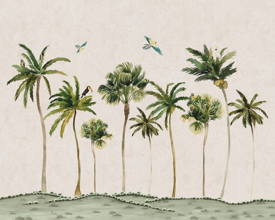 Mit ihren eleganten, in Aquarell gemalten Palmen schafft diese Schlafzimmertapete eine ruhige und exotische Atmosphäre, die sich ideal für einen Ruhebereich eignet. In einem Flur verleiht sie einen Hauch von Frische und Eleganz und macht jeden Durchgang angenehm und hell.