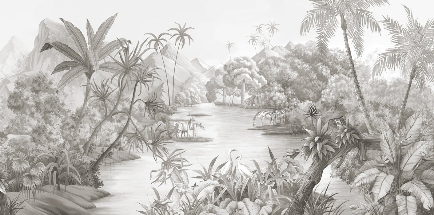 Verwandeln Sie Ihr Lokal und schaffen Sie eine exotische Dekoration mit der Fototapete Restaurant Dschungel malerisch. Eine realistische, illustrierte Panorama-Tapete, die sich perfekt in Ihr Lokal einfügen wird. Die warmen Farben dieser Tapete machen Ihr Ambiente gemütlich. Eine XXL-Wanddekoration, die ideal ist, um die visuelle Identität Ihres Lokals im Handumdrehen zu ändern. Entdecken Sie unsere Kollektion der Dschungel-Tapeten für Restaurants. Unsere maßgefertigten Tapeten werden in Frankreich hergestellt. Unsere ERP-Tapeten sind feuerbeständig M1 BS1D0.
