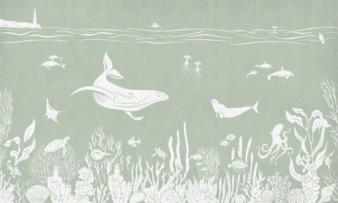 Das Zimmer Ihres Babys oder Kindes wird mit unserer grünen Wasserspaziergang-Tapete verwandelt. Diese monochrome grüne Tapete mit ihrer Pastellfarbe macht die Atmosphäre im Zimmer Ihres Kindes weicher und ruhiger. Ideal für die Begleitung und Entwicklung der Wachheit Ihres Kindes, erzählt diese Kindertapete Meerestiere zarte Geschichten. Lassen Sie uns gemeinsam zwischen Delfinen, Walen, Fischen und Korallen tauchen, um zu staunen und spielerisch zu lernen. Das Grün dieser Tapete ist sanft.