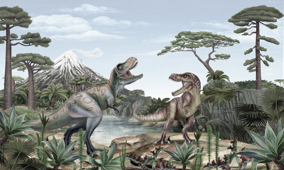Auf dieser maßgefertigten Fototapete finden Sie zwei Dinosaurier, eine T-Rex-Familie, die ihren Aktivitäten im Wald nachgehen. Im Hintergrund finden Sie Vegetation, einen See und einen Berg, so dass Sie ganz in diese Welt eintauchen können.