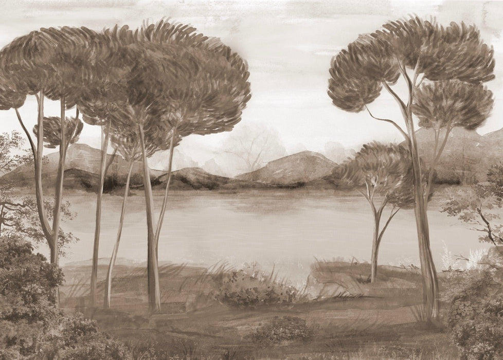 Verleihen Sie Ihren Innenräumen zeitlose Eleganz mit dieser Panorama-Tapete in Sepia, die von mediterranen Landschaften inspiriert ist. Schlankere Pinien stehen am Ufer eines ruhigen Sees, in einem raffinierten malerischen Stil, der an alte italienische Fresken erinnert.