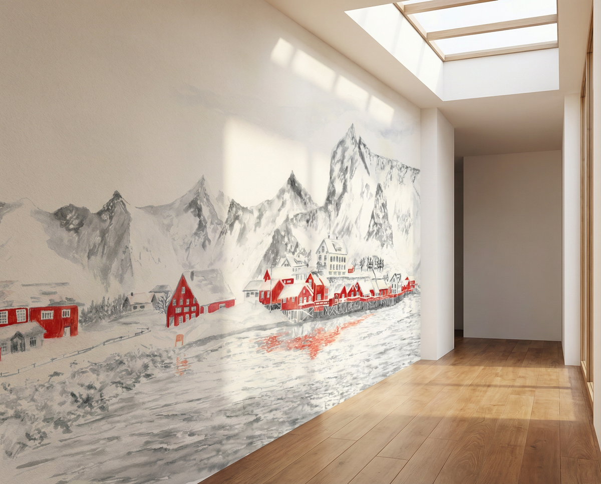 Ce papier peint panoramique Norvège est issu à l’origine d’une aquarelle originale dessinée à la main par l’artiste Flora Lacour Folliol. L’œuvre représente un paysage emblématique de Norvège : un village de pêcheurs aux maisons rouges, posé au bord d’un fjord, entouré de montagnes escarpées et enneigées, inspiré des îles Lofoten.