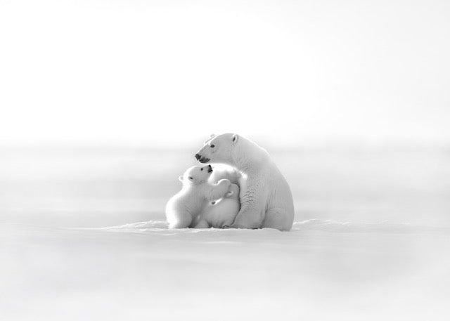 Verwandeln Sie Ihr Zuhause mit dieser Panorama-Tapete, die eine Eisbärenfamilie zeigt und sich ideal für eine Hüttendekoration eignet. Tauchen Sie ein in eine nordische Atmosphäre, in der diese majestätischen Tiere anmutig durch den unberührten Schnee schreiten, umhüllt von einem geheimnisvollen Nebel im Hintergrund.