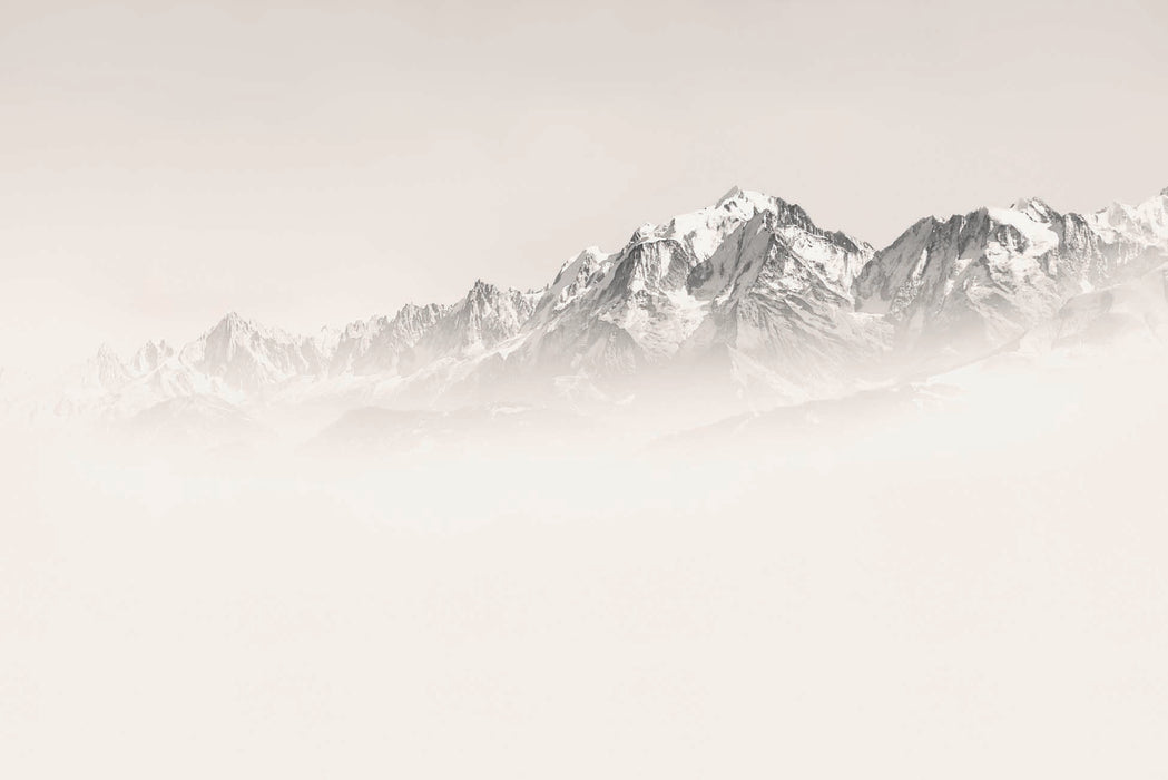 Diese bergige und neblige Panoramalandschaft lädt Sie in eine friedliche und ruhige Atmosphäre ein. Schaffen Sie eine inspirierende und entspannende Atmosphäre mit unserer maßgefertigten Fototapete Mont Blanc im Nebel.