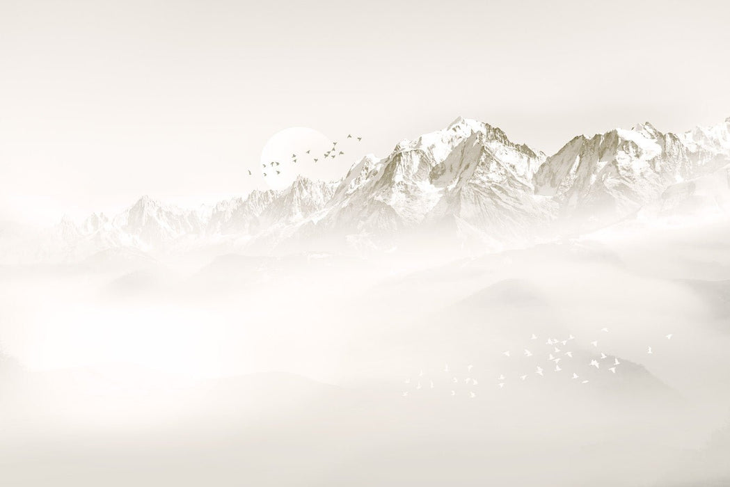 Verwandeln Sie Ihr Zuhause mit unserer Bergtapete "Weißer Berg, Mond und Vogel", einem einzigartigen Panorama-Wandgemälde, das Ihre Wände mit einem spektakulären Blick auf die Alpengipfel veredelt. Diese Bergpanorama-Tapete ist ideal für ein Badezimmer und versetzt Sie direkt von Ihrer Dusche oder Badewanne aus in eine ruhige und inspirierende Chalet-Atmosphäre.