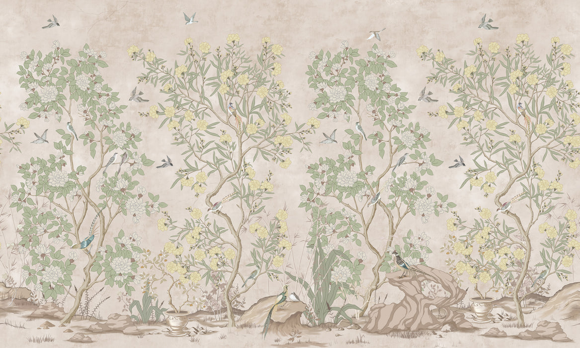 Diese Chinoiserie-Tapete stellt eine Pflanzen- und Blumendekoration dar, die in sanften Pastellfarben gehalten ist. Vögel begleiten dieses Bild, um ihm etwas Sanftes und Originelles zu verleihen.