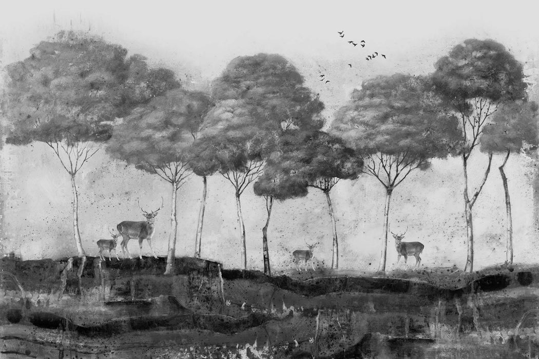 Diese Vlies-Panorama-Tapete Mystische Kiefern & Hirsche ist ideal, um eine spektakuläre Wanddekoration in Grau zu schaffen. In trendigem Schwarz und Weiß gehalten, ist diese Tapete wie ein Wandgemälde, eine einzigartige Kreation, die Ihre Wände schmückt. Ein Wandgemälde für einen eleganten und exotischen Stil. Mit unserer maßgefertigten Panorama-Tapete ganz einfach ein einzigartiges Interieur schaffen.