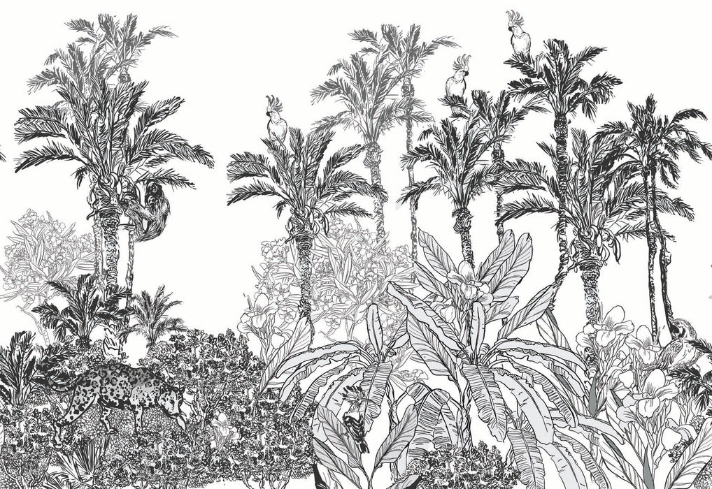 Auf dieser Tapete finden Sie eine Vielzahl von Dschungeltieren wie Panther, Papagei, Vogel und Affe, die sich harmonisch in die Umgebung einfügen. Die Grautöne weichen die schwarz-weißen Striche auf und schaffen so einen auffälligen und eleganten Kontrast.