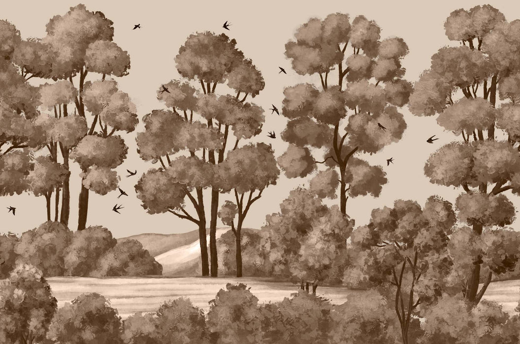 Verschönern Sie Ihr Zuhause mit der Fototapete Landschaft Fluss Wald Sepia. Diese pflanzliche Wandmalerei ist ideal, um Ihrem Raum Tiefe zu verleihen und seine Dimension zu verändern. Ein Wandkunstwerk, das aus einem Künstlergemälde resultiert und ebenso fesselnd wie verträumt ist. Dieses Wanddesign im Aquarellstil stellt eine hübsche Lichtung mit Bäumen und Vögeln dar. Lassen Sie Ihre Wände träumen, indem Sie bei sich zu Hause eine Panorama-Tapete anbringen, die einem Meisterwerk würdig ist! Diese maßgefertigte Tapete ist in verschiedenen Farben erhältlich, sodass sie sich an jedes Ambiente anpassen lässt.