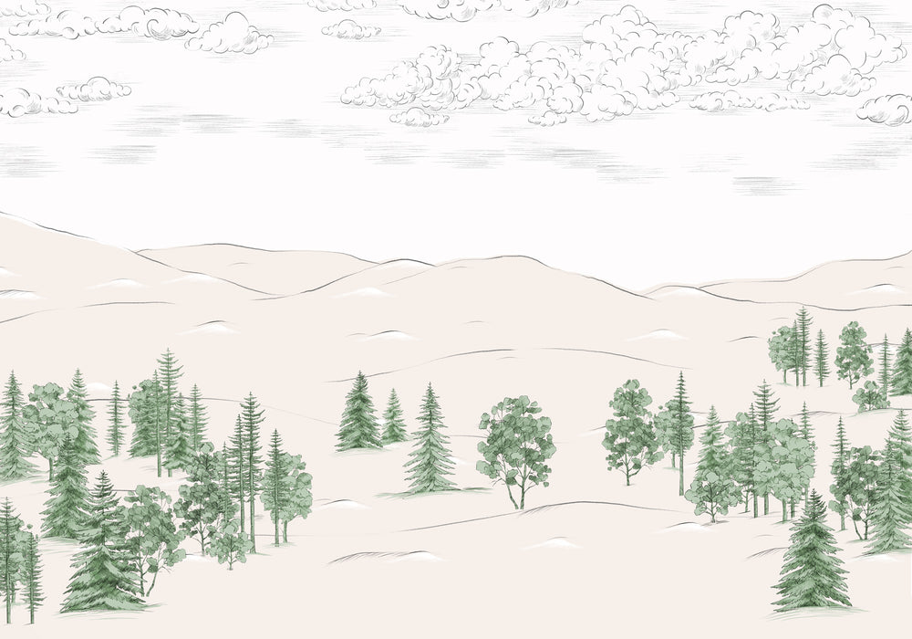 Tauchen Sie mit unserer Panorama-Tapete "Esquisse des Cimes" in der zweifarbigen Version Waldgrün Beige Leinen in die zauberhafte Atmosphäre der Berggipfel ein. Diese französische Kreation, die mit Sorgfalt und Leidenschaft hergestellt wurde, fängt die Majestät der Berge mit Bleistiftzeichnungen von Bäumen, Buchen und ineinander verschlungenen Wolken in Beige- und Waldgrüntönen ein.