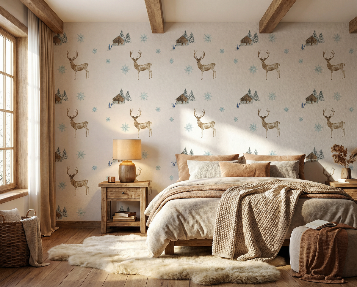 Ce papier peint motif montagne met en scène un décor répétitif raffiné composé de cerfs majestueux, de chalets alpins, de sapins enneigés et de flocons de neige, dans une palette douce et chaleureuse. Inspiré de l’univers montagne et chalet, ce motif crée une ambiance cocooning, élégante et authentique, idéale pour les intérieurs alpins et les décorations hivernales chic.