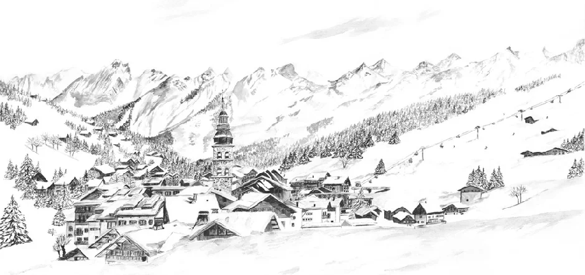 Papier peint panoramique La Clusaz en peinture - Noir et blanc